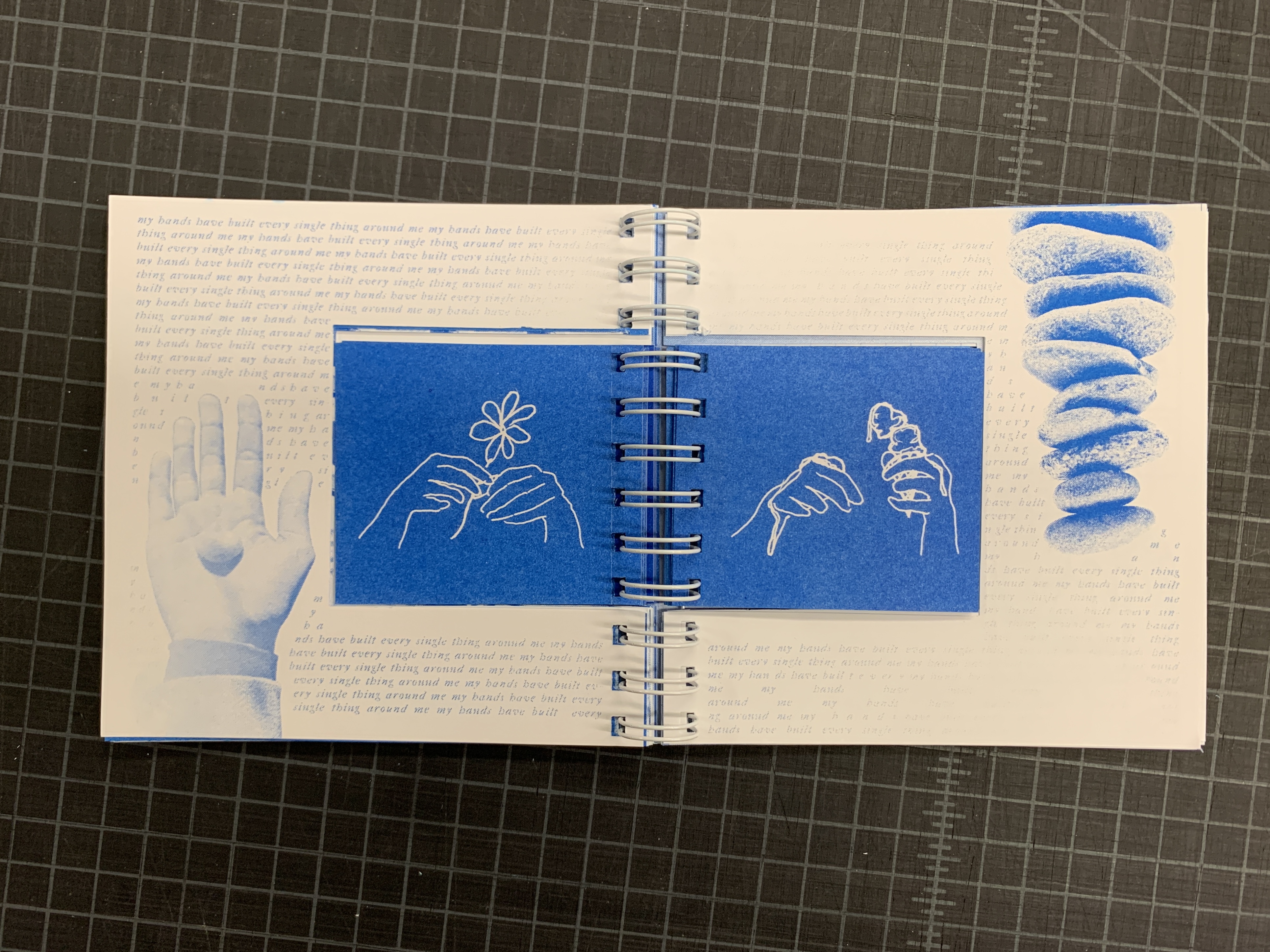 spiral bound, hand-cut, risographed book with two flippable elements